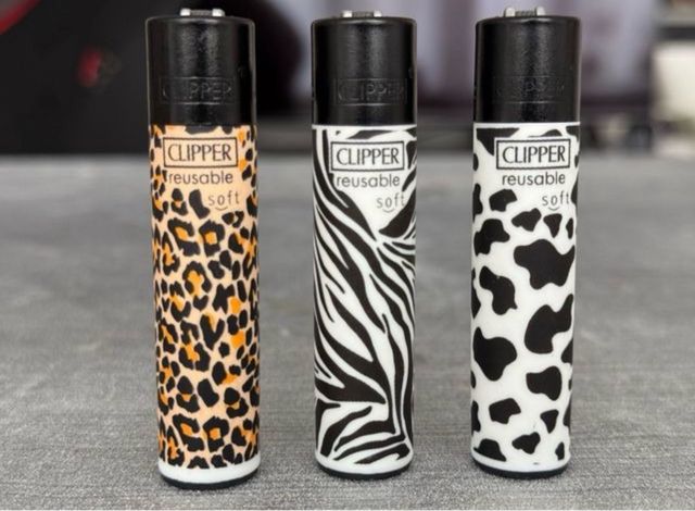 Set di tre accendini della marca Clipper con design originali. - Design leopardo. - Design zebra. - Design mucca.
