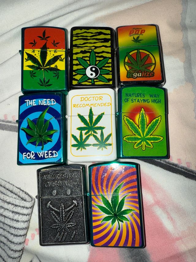 Dettagli del prodottoSet di nove accendini con disegni ispirati alla cannabis e ai motivi rastafariani.