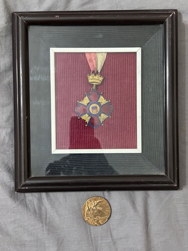 Dettagli del prodottoMedaglia e croce commemorativa dell'Esposizione di Economia Domestica tenutasi a Parigi nel 1935. L'oggetto è incorniciato con un nastro rosso e una cornice scura.