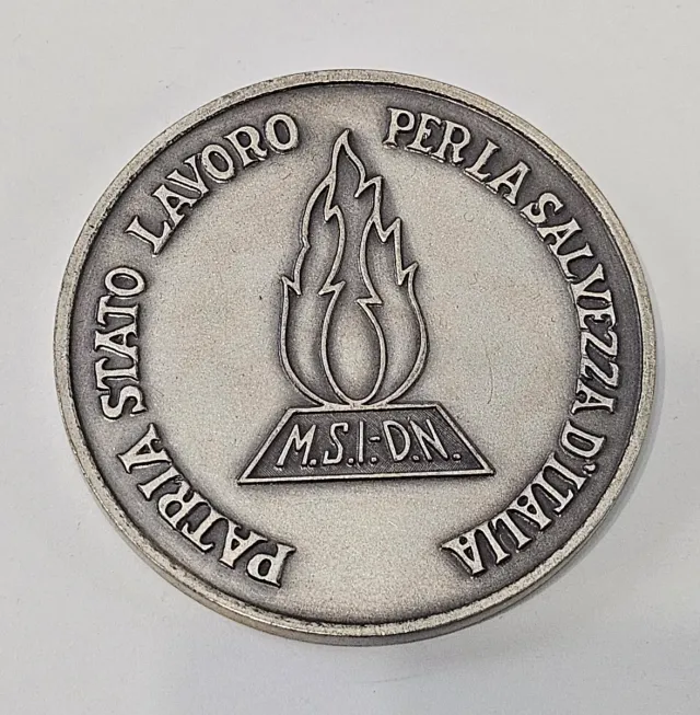 Medaglia commemorativa del Centenario MSI-DN. - Simbolo della fiamma. - Scritta PATRIA STATO LAVORO PER LA SALVEZZA D'ITALIA. - Sigla M.S.I.-D.N.