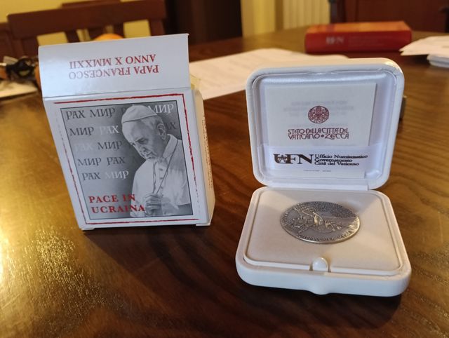 Dettagli del prodottoMedaglia in argento (Ag 925/000 peso 23 g) emessa dallo Stato della Città del Vaticano nel 2022 sotto il pontificato di Papa Francesco come appello alla Pace in Ucraina. Tiratura 3000 pezzi.