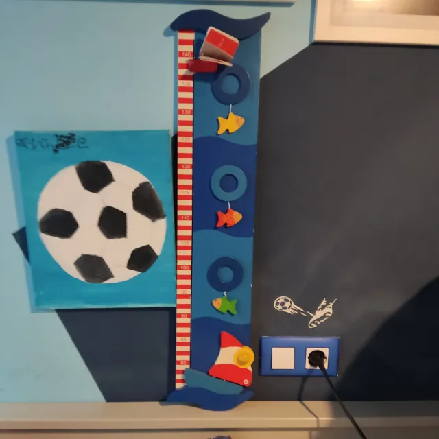 Dettagli del prodottoMisuratore di altezza per bambini con design marino e dettagli di pesci. - Base blu con onde. - Scala di misurazione in centimetri. - Decorazioni di pesci e barca in legno. La descrizione è stata tradotta automaticamente.