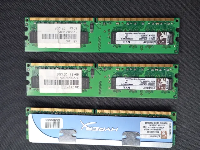 Dettagli del prodottoSet di tre moduli di memoria RAM DDR2 del marchio Kingston. Capacità totale di 4GB (1 modulo da 2 GB e 2 da 1GB). Quella da 2 GB costa 9€ e quelle da 1GB costano 5€ ciascuna. Tipo di memoria: DDR2. Produttore: Kingston. La descrizione è stata tradotta automaticamente.