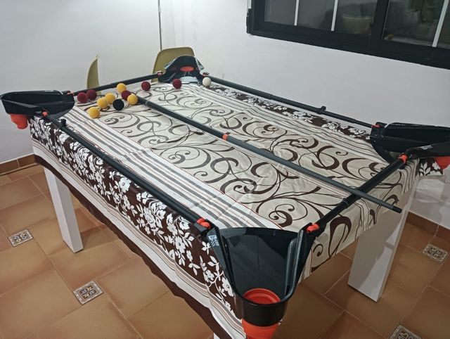 Dettagli del prodottoAccessori per poter allestire un tavolo da biliardo in casa. Ha i suoi 4 angoli dove cade la palla. Le palline sono in velluto per non graffiare il tavolo. Gli angoli sono fissati con 4 barre che si adattano alla larghezza del tavolo. È adatto sia per tavoli rotondi che rettangolari o quadrati. Inoltre viene fornito con un bastoncino e lo stampo dove puoi mettere le palline.