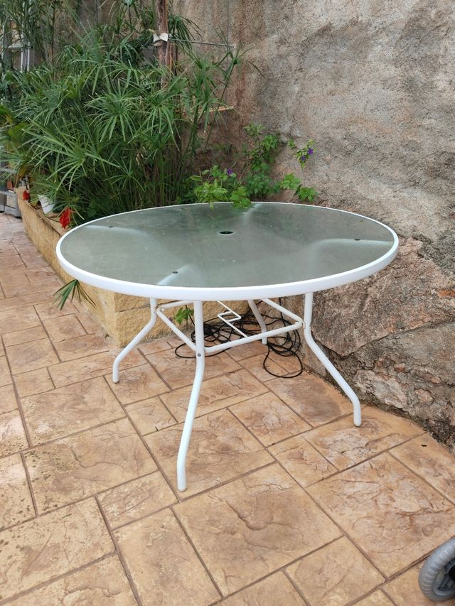 Tavolo da esterno con struttura in metallo per giardino rotondo.