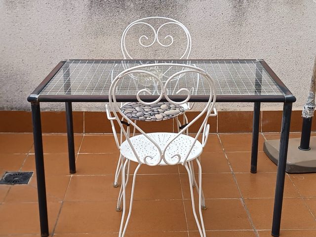 Dettagli del prodottoSet di 4 sedie in ferro battuto di colore bianco, con design classico e schienale a forma di cuore.