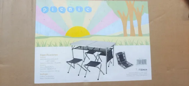 Dettagli del prodottoSet di tavolo e sedie pieghevoli per picnic, ideale per campeggio o escursioni. Facile da montare e trasportare. Materiale della struttura: Alluminio. Materiale del tavolo: MDF. Materiale delle sedie: Alluminio e poliestere. Dimensioni del tavolo: 120x60x75 cm. Dimensioni delle sedie: 40x30x34 cm. Peso massimo supportato per sedia: 100 kg. Include: 4 sedie e sacca di trasporto. La descrizione è stata tradotta automaticamente.