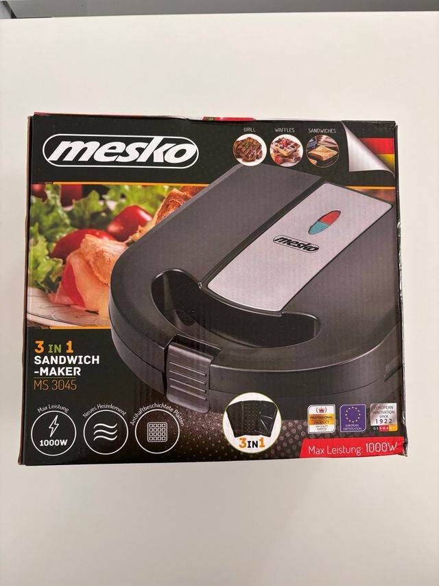 Vendo piastra per sandwich Mesko MS 3045, 3 in 1. È nuova. - Funzioni: griglia, piastra per waffle e panini. - Potenza: 1000W. - Design compatto e maneggevole.