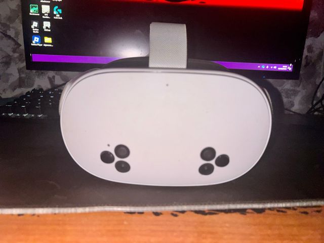 Visore per realtà virtuale Meta Quest 3. - Design bianco. - Cinghia regolabile per il comfort. - Pulsanti neri sulla parte anteriore.