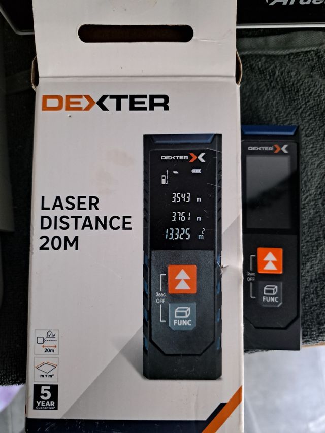 Metro laser DEXTER per misurazioni di distanza. - Portata massima 20 metri. - Funzione m+m². - Garanzia 5 anni.
