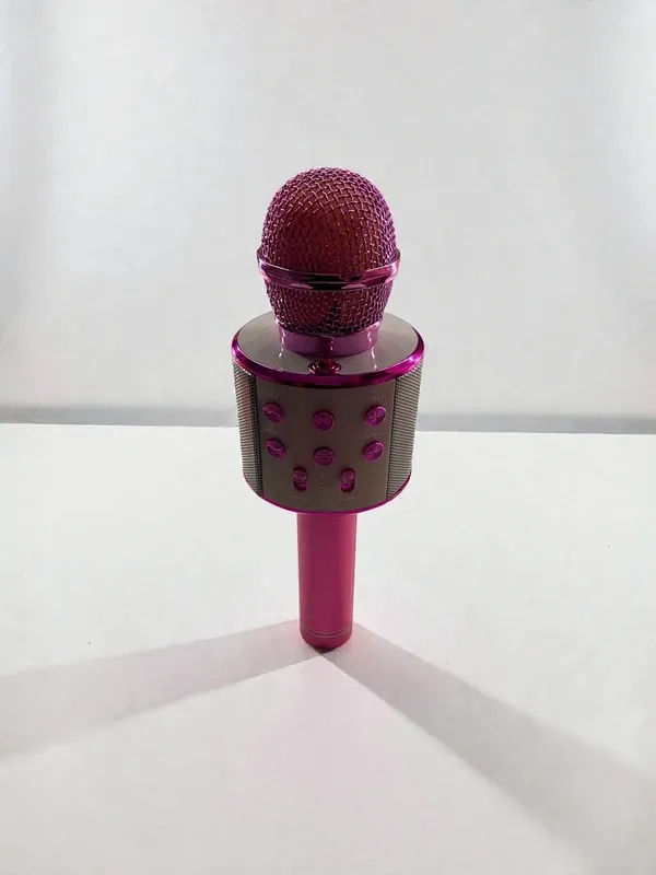 Microfono wireless di colore rosa con finiture metalliche. - Design moderno e accattivante. - Griglia superiore decorata.