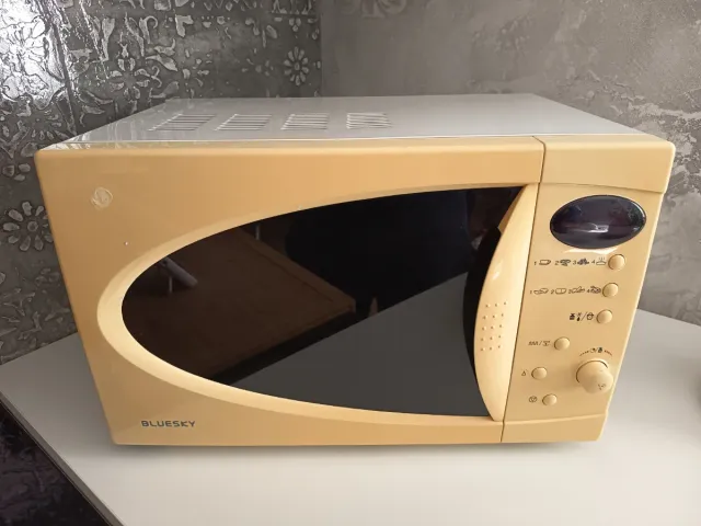 Microonde di colore giallo e bianco, con un design moderno e una porta ovale. - Marca: Bluesky - Colore: Giallo e bianco - Porta ovale con vetro scuro - Pannello comandi laterale