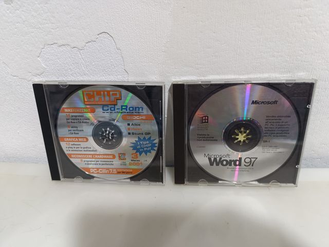 Dettagli del prodottoCD-ROM di Microsoft Word 97, Chip computer e comunicazione, vendibili anche separatamente a 5€ l'uno, grafica web, masterizzare, riconoscere l'hardware, anni 90'-2000', dischi vintage per pc