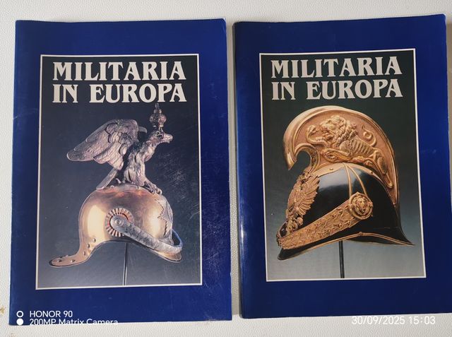 Due volumi Militaria in Europa che esplorano cimeli militari. - Copertina blu. - Immagini di elmi storici. UN VOLUME 20 EURO.... ENTRAMBI 25 EURO