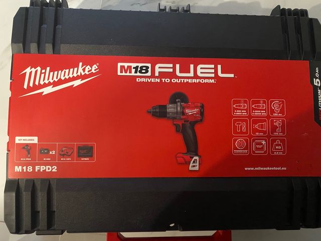 Milwaukee M18 FPD2 Fuel - Trapano avvitatore a percussione, 2 x batterie da 5.0 Ah, caricabatterie rapido, Dynacase. Nuovo, mai usato