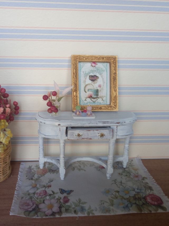 Dettagli del prodottoBellissima miniatura di una consolle consolle , bianco decapato. Perfetto per arredare una casa delle bambole! Il lotto comprende una consolle, tappeto, vassoio con profumi , vasetto con fiori e quadro in tela con cornice oro.