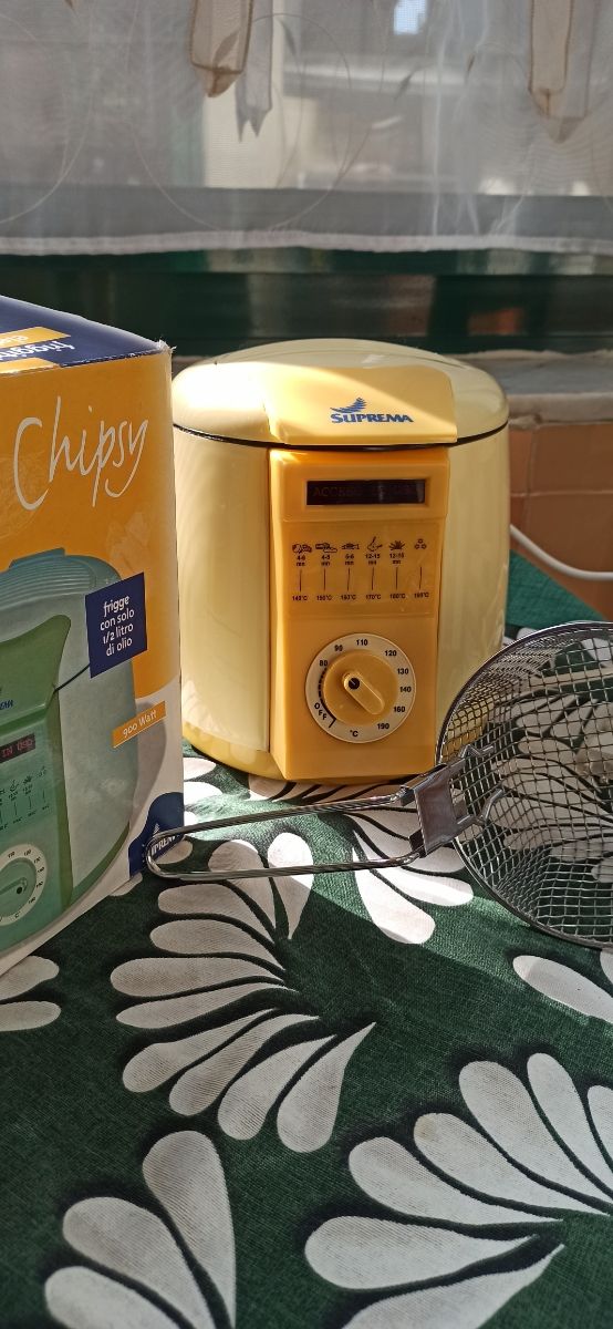 Dettagli del prodottoMini friggitrice elettrica, in buone condizioni. Dotata di cestello con manico facilmente lavabile e parte frontale con temperatura per i vari cibi. Idonea per poche persone e ottima per single o coppie. #freidora#friggitriceelettrica#friggitrice