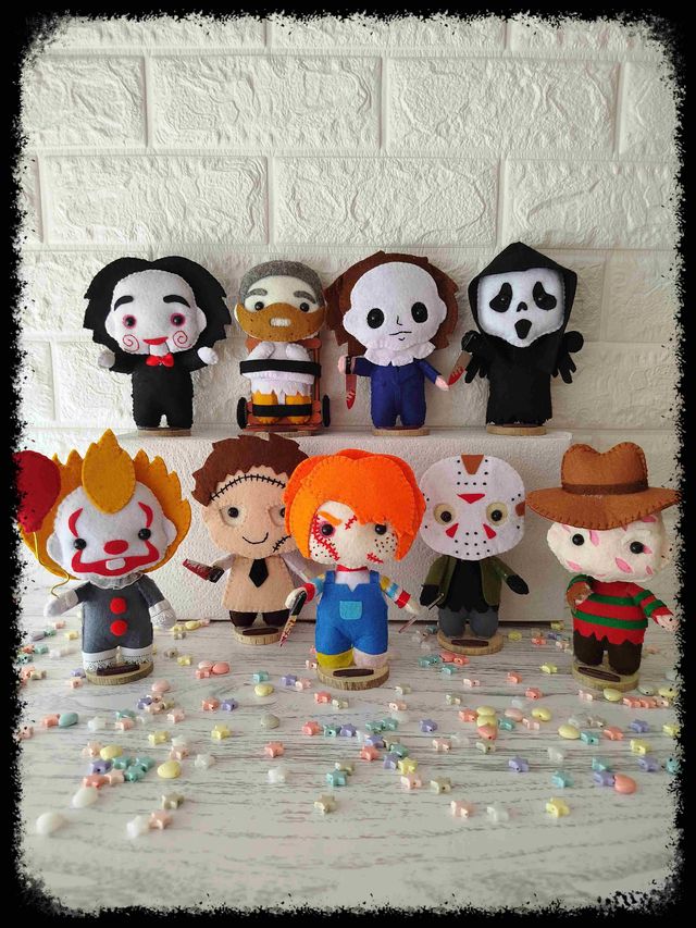 Dettagli del prodottoCollezione composta da 9 bambole in feltro fatte a mano, ispirate ai personaggi iconici della serie di Halloween. Perfetta per i collezionisti.
