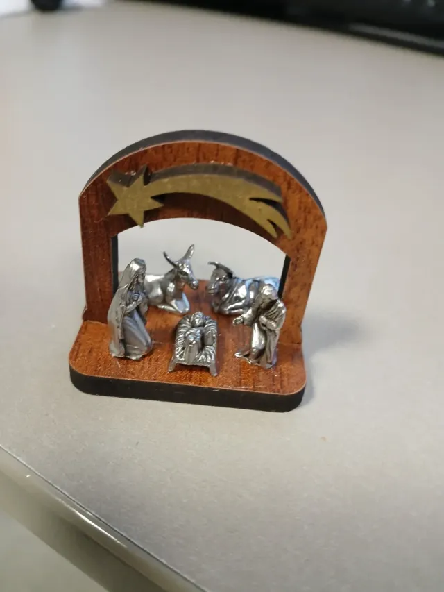 Dettagli del prodottoMini presepe moderno realizzato in legno, con una stella cometa decorativa e statuine in scala 1:100 realizzate in zama trattate argento antico.