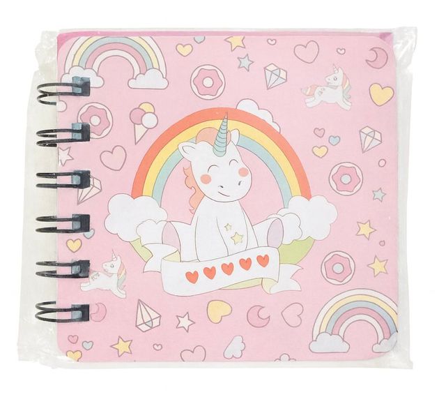 Dettagli del prodottoPiccolo taccuino rosa con copertina rigida in stile kawaii, decorata con unicorno, arcobaleni e cuori.