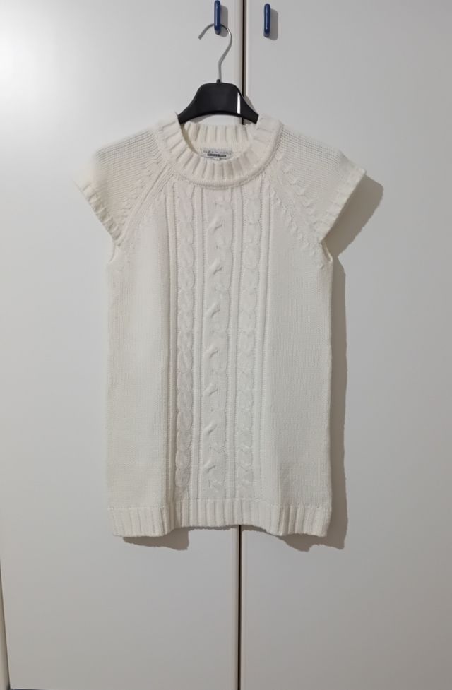 Miniabito in maglia con lavorazione centrale a trecce, girocollo, maniche corte appena accennate. Ottime condizioni, tessuto morbido, nessun difetto. Tg 13/14 anni ma veste più piccolo.