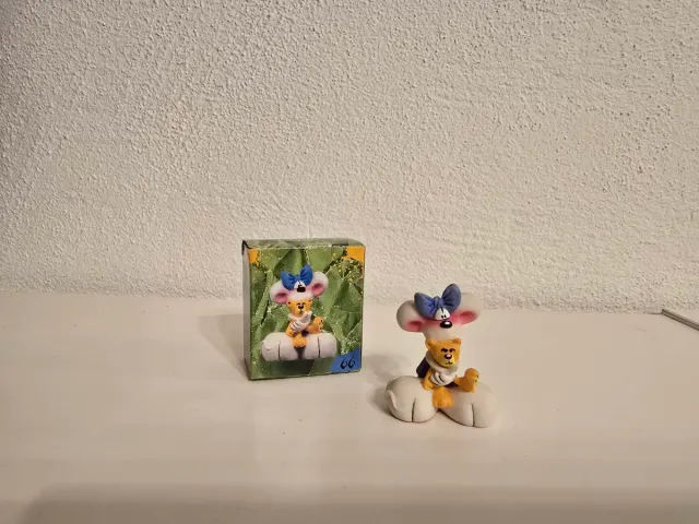 Miniatura di Diddl con un piccolo orsetto. La figura presenta Diddl con un fiocco blu e l'orsetto tra le braccia. - Dettagli colorati. - Base bianca.