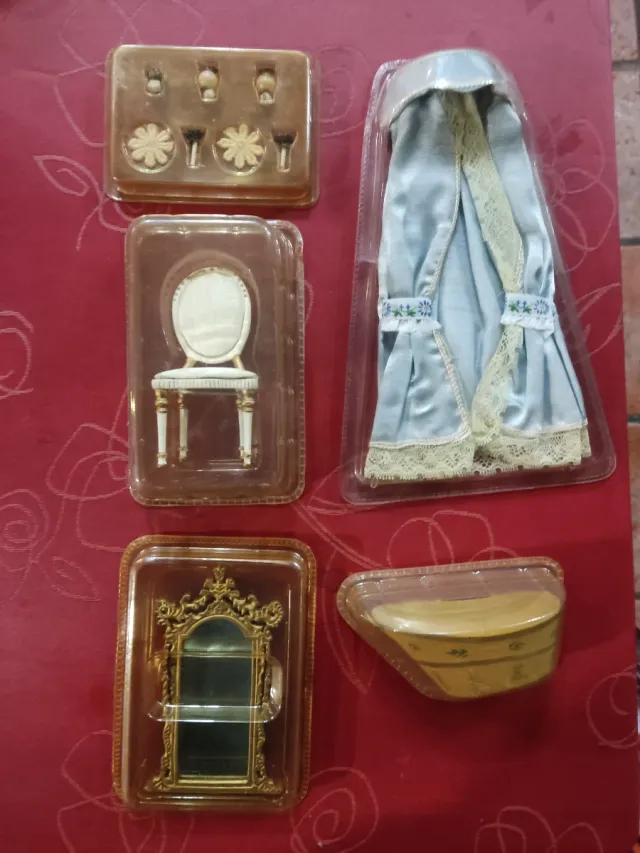 Dettagli del prodottoSet di 5 miniature per casa delle bambole. Include uno specchio dorato con cornice decorata, una sedia bianca con dettagli dorati, un mobile curvo giallo con dettagli, un set di accessori con fiori e candelabri. La descrizione è stata tradotta automaticamente.