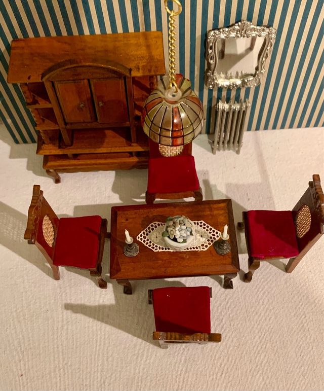 Dettagli del prodottoSet di miniature per casa delle bambole, stile vittoriano, ambientato in una sala da pranzo. Include: mobile aparador in legno, tavolo da pranzo con sedie, lampada da soffitto, specchio decorativo, radiatore, candelabri, centro fiori in ceramica e tappeto. Tutto ciò che appare nelle foto. Altre miniature per casa delle bambole nel mio profilo. La descrizione è stata tradotta automaticamente.