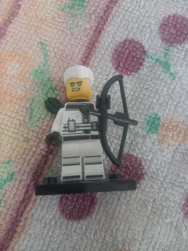 Minifigure Lego del personaje Zane della serie Ninjago. - Include arco e frecce. - Base espositiva nera.