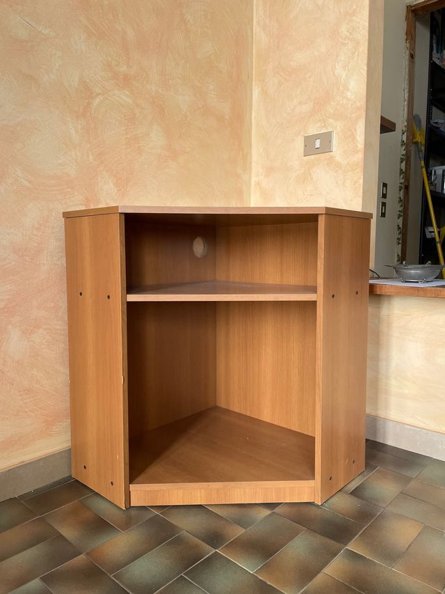 Dettagli del prodottoMobile angolare in legno melaminico con ripiano. Ritiro a mano. Misure del prodotto