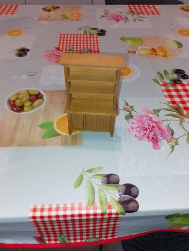 Mobile in miniatura per casa delle bambole, ideale per arredare con stile. -Misure: H 15 L 9,5 P 4 - Struttura in legno. - Ripiani e ante. - Design classico.