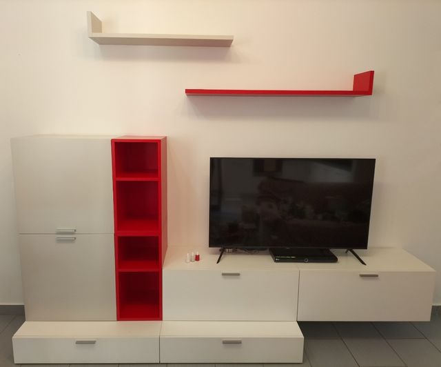 Dettagli del prodottoVendo mobile soggiorno in ottimo stato, composto da quattro cassettoni estraibili con chiusura rallentata, ripiani rossi a vista, vani grigio chiaro chiusi e due mensole.
