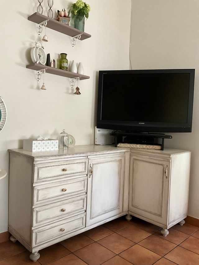 Dettagli del prodottoMobile TV ad angolo decorato a mano in stile shabby chic, bianco