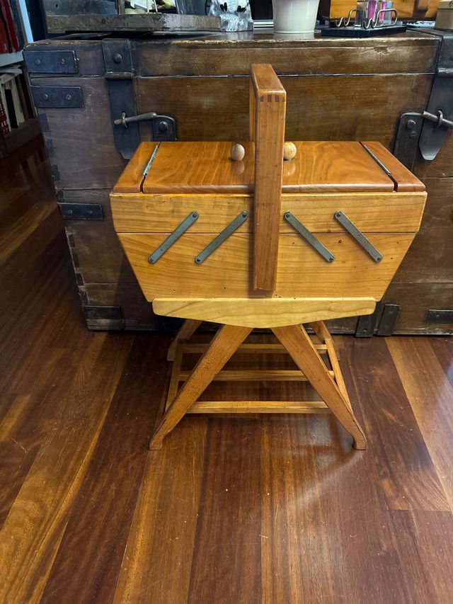 Dettagli del prodottoMobiletto portacucito in legno anni ‘50-‘60, con 3 scomparti, 2 con antina apribile superiore ed uno grande sottostante. Il contenitore principale è sorretto da una base, con ripiano sottostante, che può anche essere facilmente rimossa, svitandola, come si vede in foto. Il manico ne permette agevolmente il trasporto.
