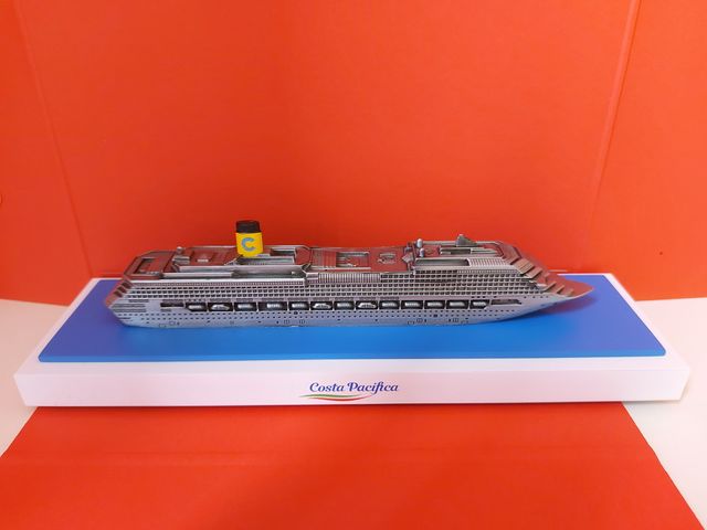 Modellino della nave da crociera Costa Pacifica in fusione di metallo. - Base espositiva bianca e blu. - Dettagli accurati della nave.