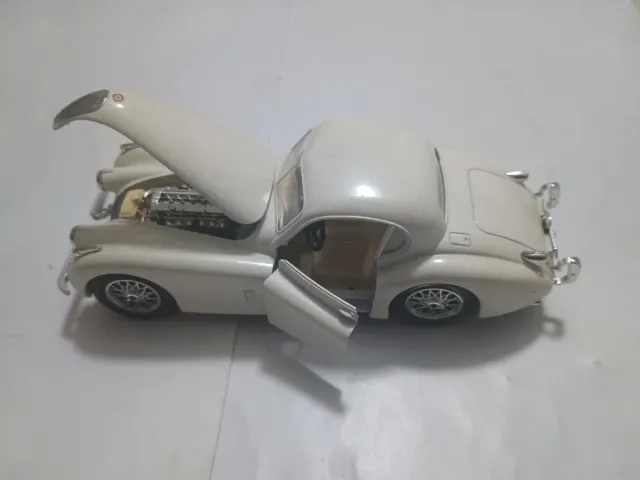 Dettagli del prodottoModellino della Jaguar XK 120 in scala 1:24, prodotto da Burago. L'auto è di colore bianco e presenta il cofano e la portiera apribili.
