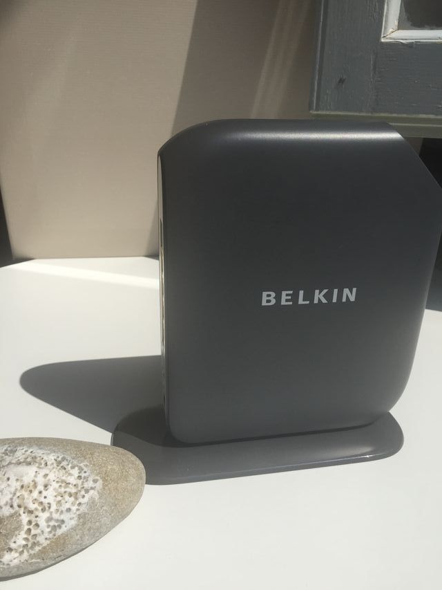 Modem Belkin di colore nero e grigio. - Design moderno e compatto. - Base di supporto inclusa.