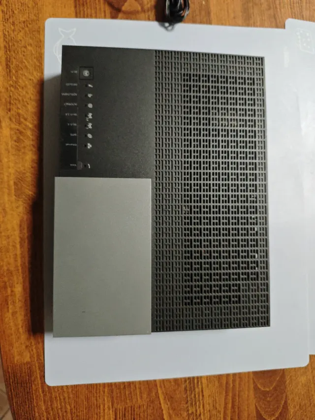 Modem TIM HUB dal design moderno ed elegante. - Rivestimento nero e grigio. - Pannello frontale con indicatori LED. - Griglia di ventilazione in alto a destra.