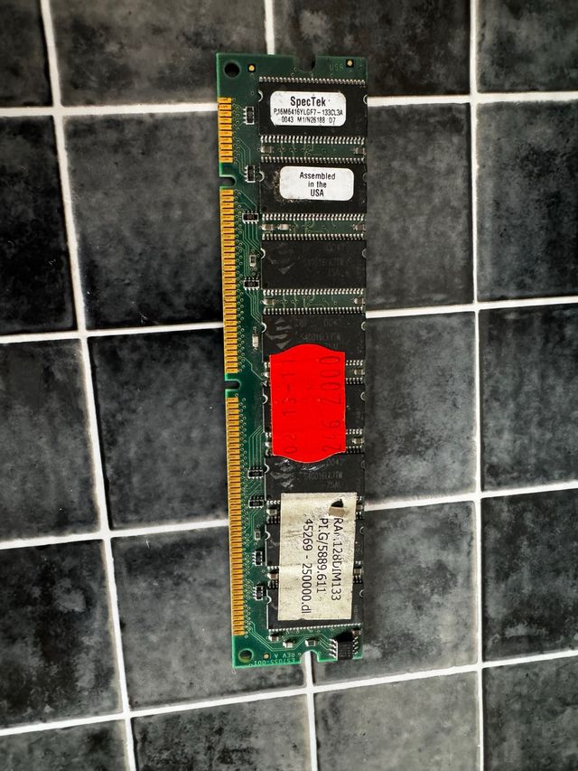 Modulo di memoria RAM per computer desktop. - Marca: SpecTek - Modello: P16M6416YLGF7-1330L3A - Capacità: 128MB - Velocità: PC133 - Assemblato negli USA