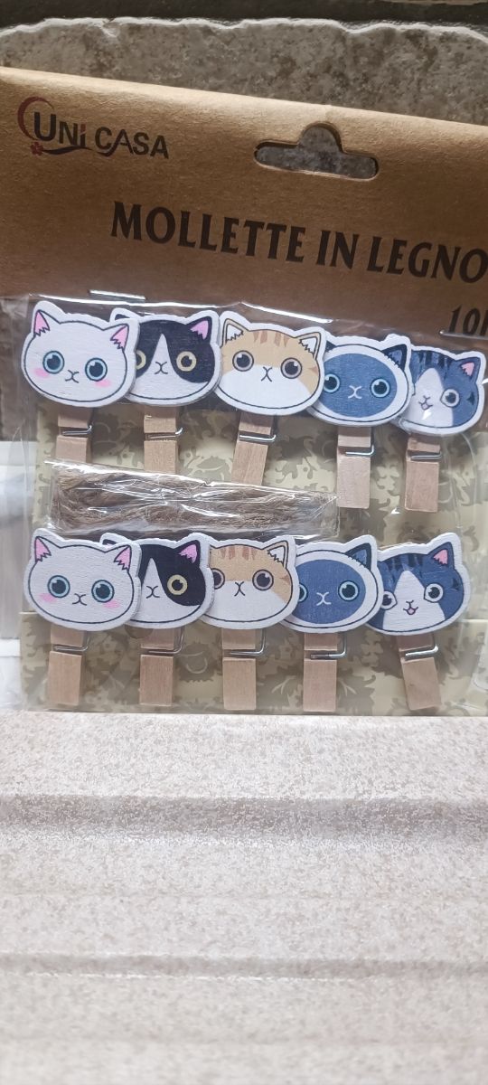 NuovoDettagli del prodottoMollette decorative in legno a forma di gattini, perfette per foto, biglietti o altri lavoretti.