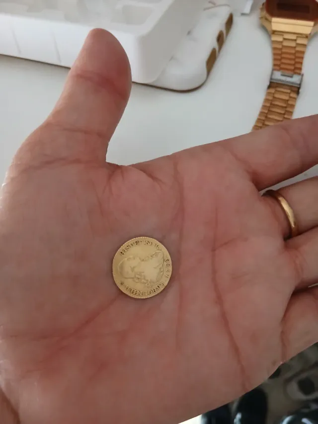 Vecchia moneta in oro con un design dettagliato. Materiale: Oro. Design: Faccia e testo incisi.