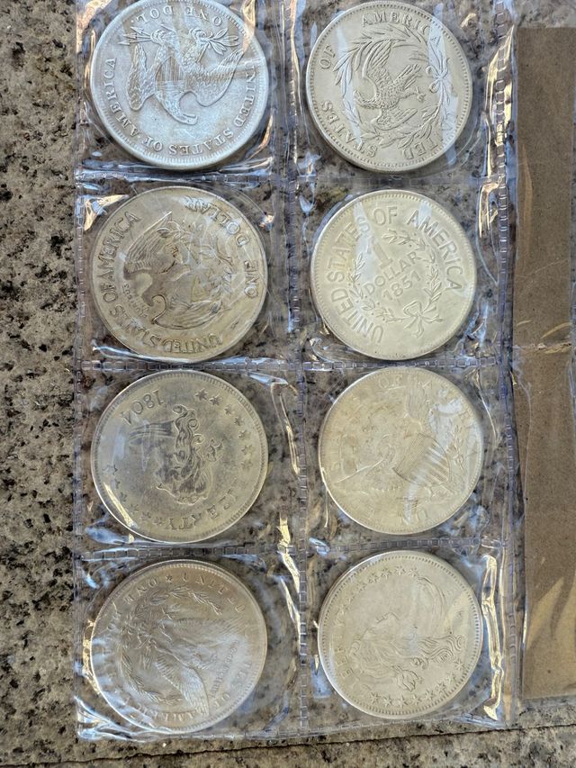Dettagli del prodottoCollezione di monete d'argento dollaro con design classici. - Monete degli Stati Uniti d'America. - Design di aquile e figure. - Alcune monete mostrano gli anni 1804 e 1851. La descrizione è stata tradotta automaticamente.