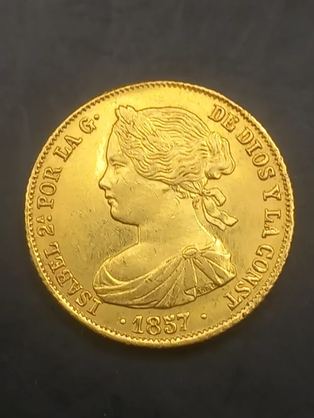 Spagna. Regina Isabella II 1857. Valore nominale 100 reali. Peso 8,41 g oro 21k. Zecca di Siviglia