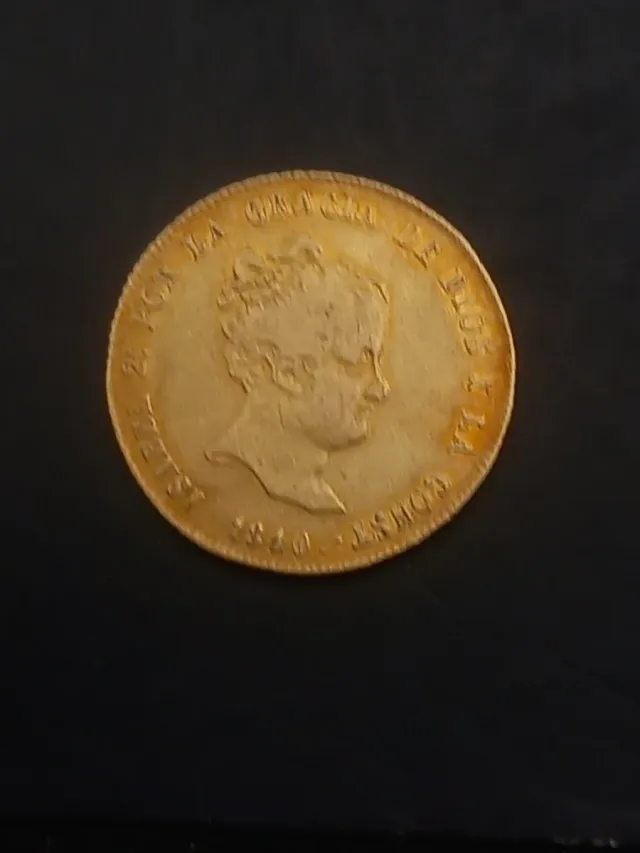 Moneta Spagna regina Isabella II 1840 zecca Siviglia. Peso 6,74 g oro 21k. Valore nominale 80 reales