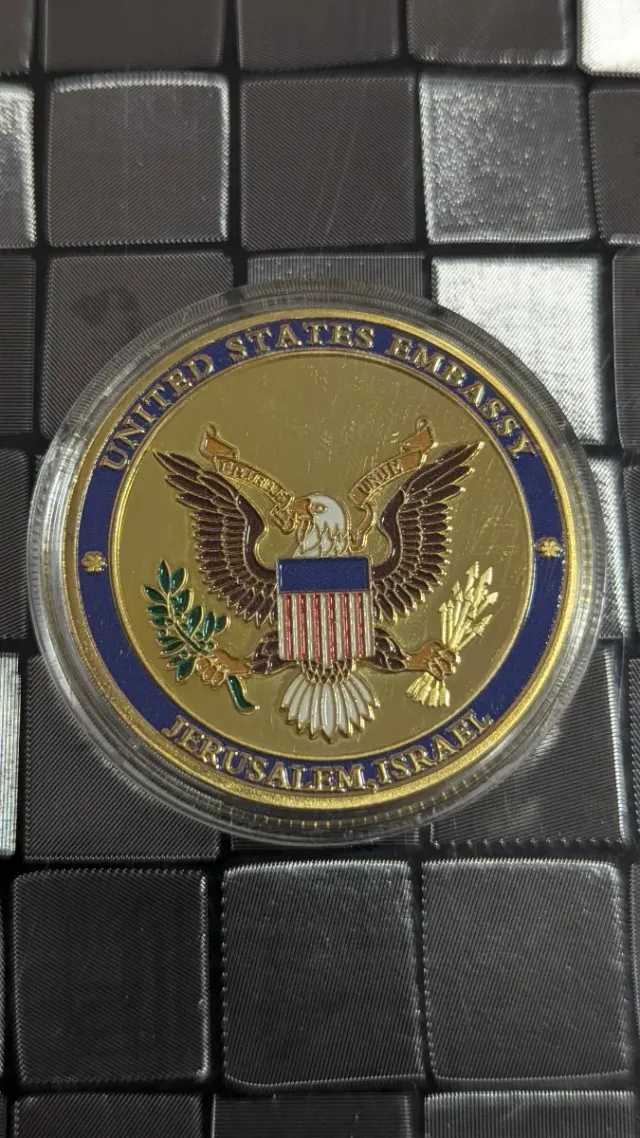 Dettagli del prodottoLe monete commemorative dell'ambasciata degli Stati Uniti a Gerusalemme, Israele. Design dettagliato con aquila e scudo. Per collezionisti.