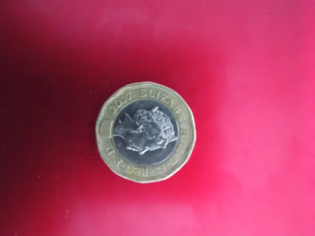 Dettagli del prodottomonete inglesi da una sterlina del 2017 con la testa della regina Elisabetta II. Presenta un'insolita stampa circolare.