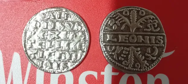 Dettagli del prodottoSet di due antiche monete commemorative con incisioni dettagliate. Una moneta presenta iscrizioni su più righe. L'altra moneta ha la parola LEONIS al centro e motivi decorativi. La descrizione è stata tradotta automaticamente.