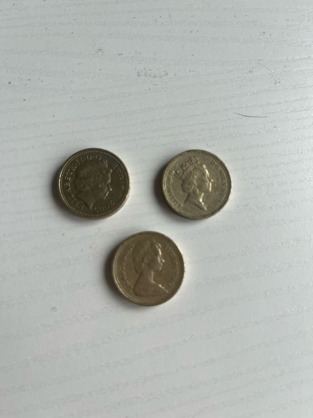 Set di tre monete inglesi. Design con il profilo della Regina. Monete da collezione.