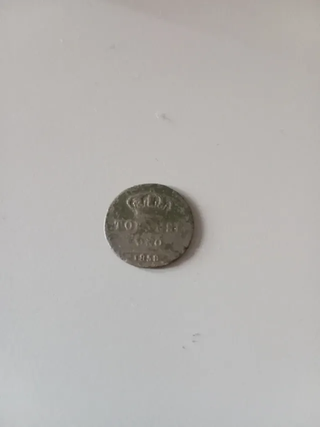 Moneta da 1 tornese coniata nel 1858. Presenta una corona stilizzata nella parte superiore. - Valore: 1 tornese - Anno: 1858
