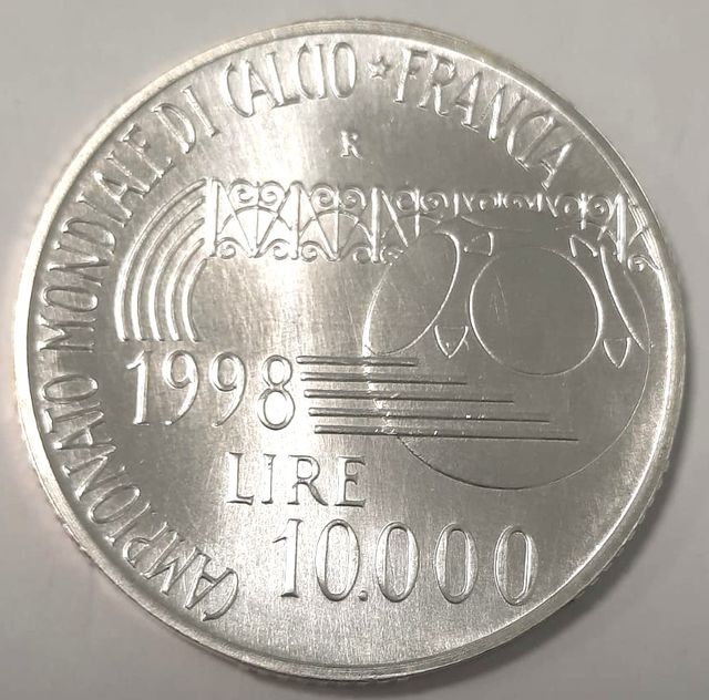 Moneta commemorativa in argento da 10.000 Lire. - Emissione speciale per il Campionato Mondiale di Calcio Francia 1998. - Realizzata in argento.